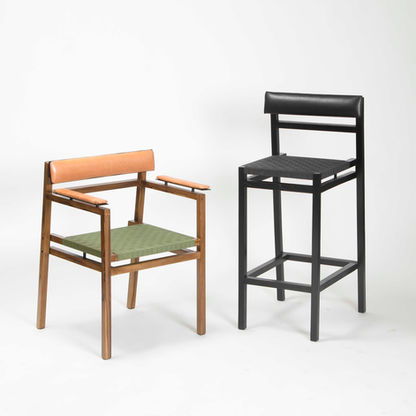 Estructura en madera de petiribi, con piezas vinculares en aluminio macizo. Soporte del respaldo en chapa curvada, revestida en cuero natural (negro o natural). Asiento en cinta gross tejida de alta calidad. Apoyabrazos en planchuela revestida con cuero natural.